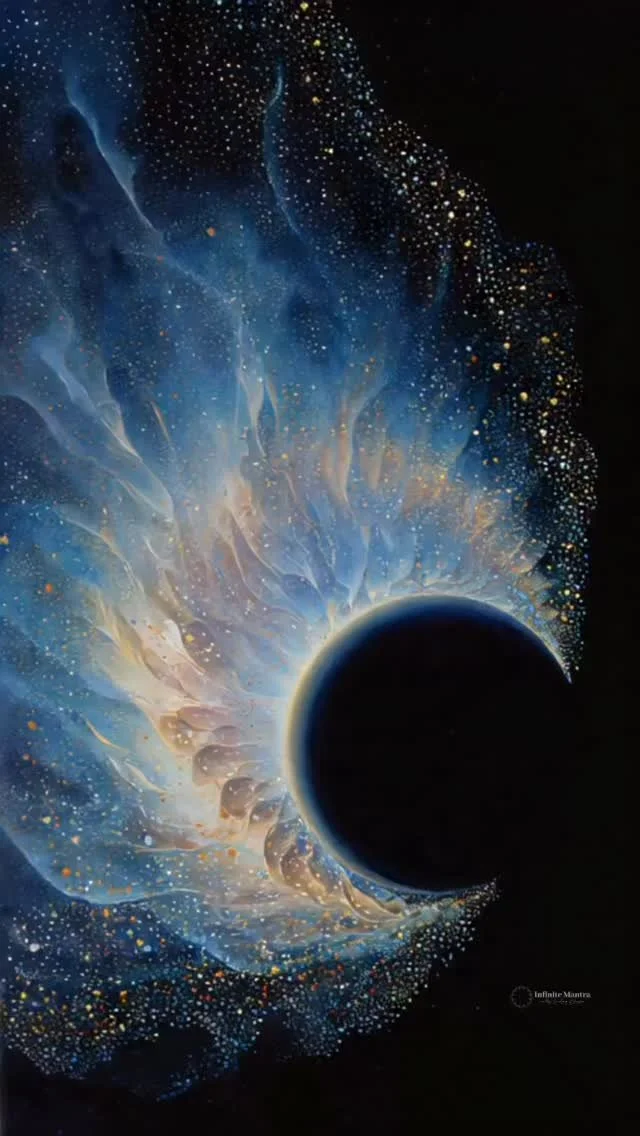 From a single radiant core, the cosmos blossoms, a pulse that is both heartbeat and supernova, cell and constellation.